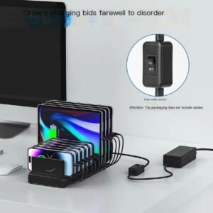 - Universal Compatibility & Smart Indicators – Designed for versatility, this 10port charging station isfully compatible with a wide range of devices including iPhone, Android smartphones, iPads, tablets, wireless earbuds, Kindle e-readers, and popular gaming accessories. Convenient smart LED indicators provide clear, real-time visibility into the charging status of each connected device, so you always know when your gadets are powered up.